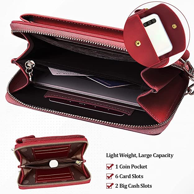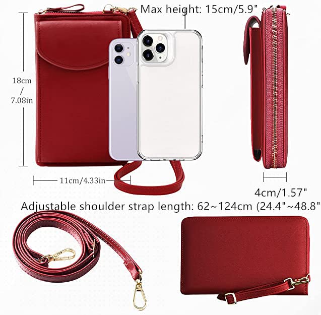 【Phone Pouch & Wallet in ONE】The Whole Purse size: 7.08″x4.33″x1.57″; It fits as much as 6.5″ Mobile phone, Mobile phone pocket size: 15cm x 9cm x 2cm(5.9″ x 3.5″ x 0.78″), compatible with iPhone 8, 8plus, X, XR, Xs max and so on. Shoulder strap drop: 27.7″~51.2″(Adjustable & Removable);