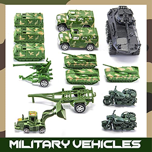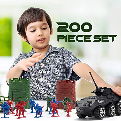 200-Piece Set. With 200 pieces in all, the action-packed JaxoJoy Military Set includes a couple of army men, quite a few vehicles, forts, barricades, tents and other accessories to keep children engaged for hours without a end.