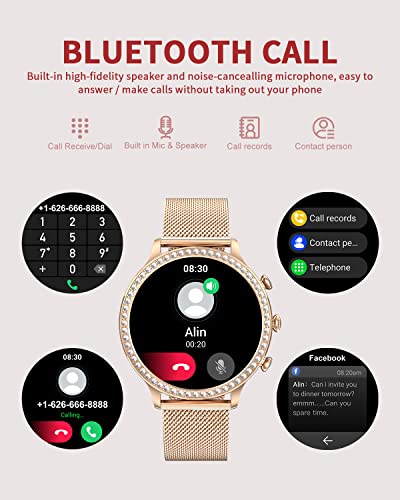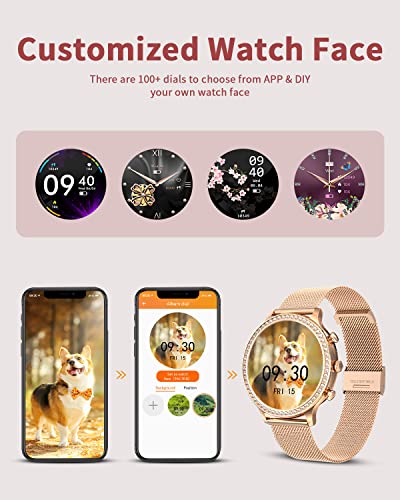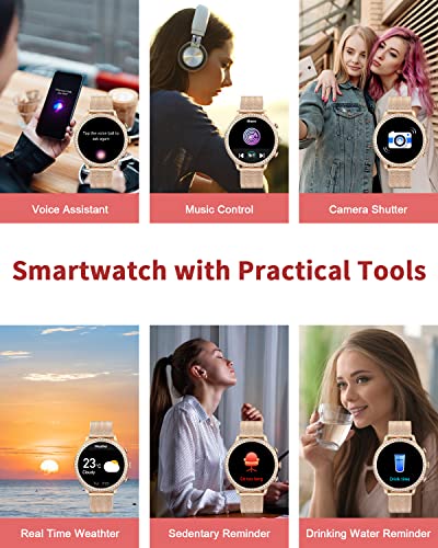 ⌚【Fashion and Multifunction Smart Look ahead to Women】Ladies smart watch adopted 1.32” full touch round screen and 360*360 resolution, brings smooth touch and excellent visual experience. More auxiliary functions: voice assistant, female period monitoring, search bracelet, time display, remote photography, music regulate, stopwatch, timer, weather, alarm clocks, 5 levels brightness and more. As well as, this gold smart watch adds a passward lock function to give protection to your individual data