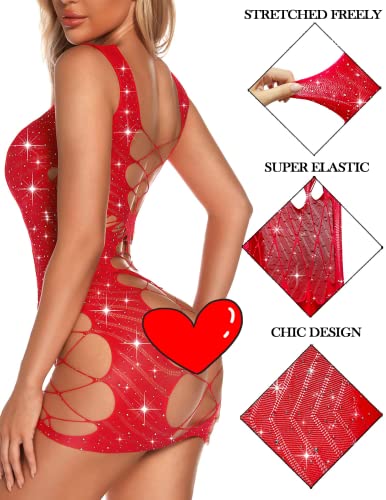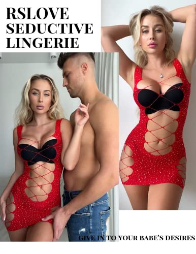 RSLOVE Womens Fishnet Lingerie Mesh Chemise Babydoll Bodysuit Lace Smock Lingerie for Women Red